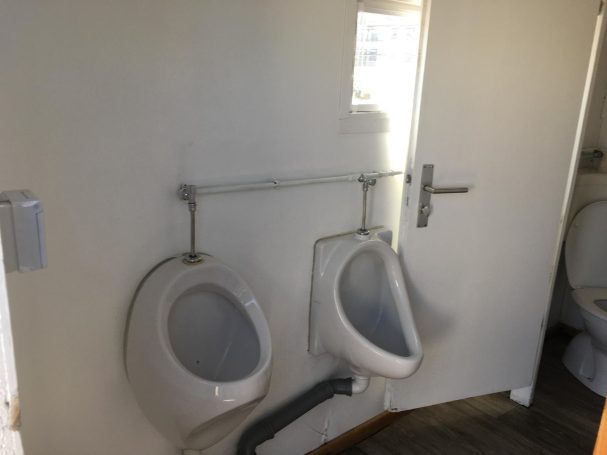 Damenbereich: 1 WC · Herrenbereich: 1 WC, 2 Urinale, 1 gemeinsames Handwaschbecken